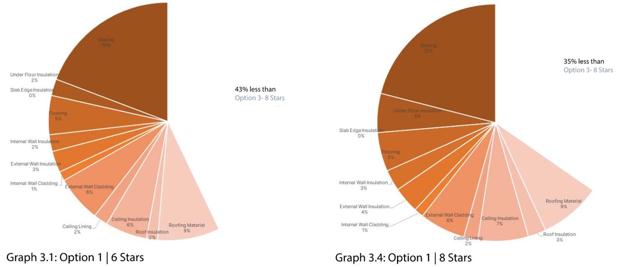 Across all scenarios, the results revealed clear patterns in how different materials contribute to embodied carbon. In lightweight construction, glazing emerged as the dominant carbon hotspot, contributing approximately one-third of total embodied emissions. In medium-weight construction, the concrete slab was responsible for a similar share, highlighting how the introduction of concrete significantly increases the carbon intensity of the home. In heavyweight construction, brick cavity wall systems were the single largest contributor, accounting for roughly 25% of total embodied emissions and reinforcing the known emission intensity of masonry-dominant structures. Regardless of these differences, glazing remained a consistently large contributor across all construction types and star ratings, underscoring the carbon cost of achieving high-performance thermal envelopes.