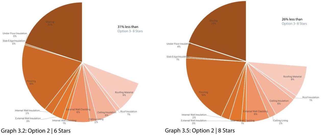A particularly important finding for Development WA was the impact of upgrading each construction type from 6 stars to 8 stars. Although achieving an 8-star rating requires additional insulation, enhanced glazing performance, and improved envelope specifications, the overall increase in embodied carbon was found to be relatively small. In most cases, the uplift in carbon intensity was marginal when compared with the total embodied emissions of the dwelling. This means that the environmental “cost” of going from 6 stars to 8 stars is minimal in embodied-carbon terms, while the benefits of improved thermal performance, occupant comfort, and long-term energy efficiency, including operational emissions and cost reductions, are significant.